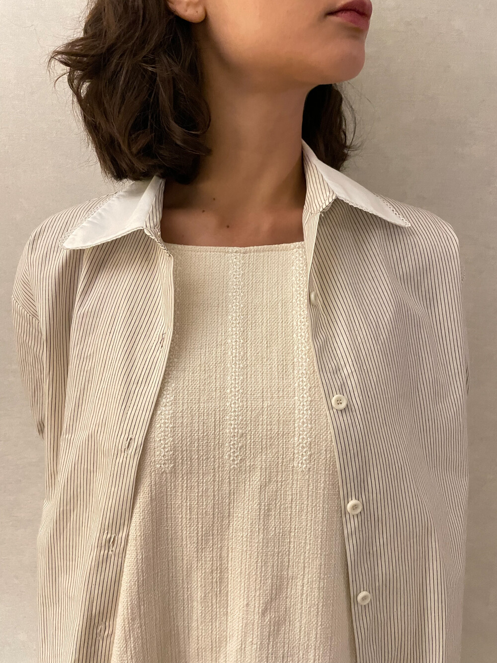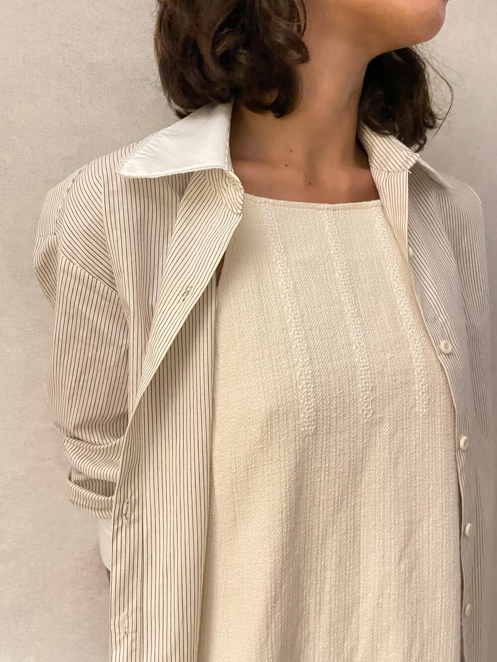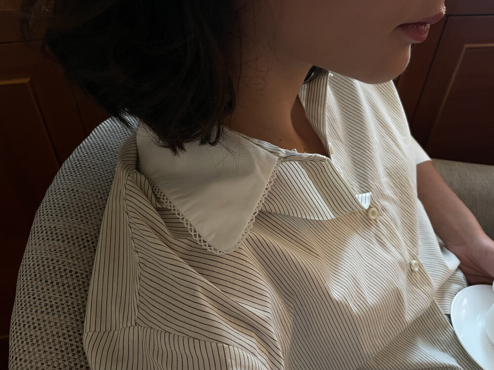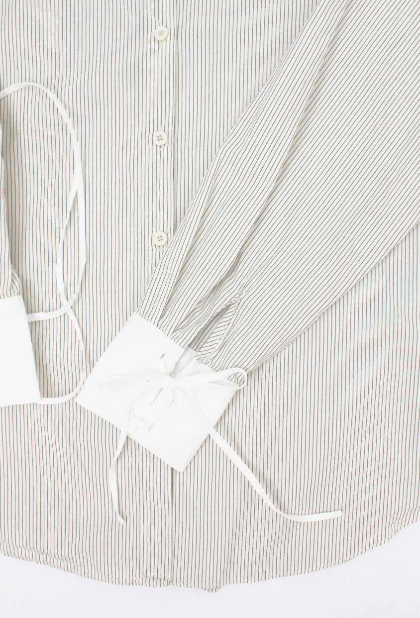 크림 바탕에 브라운 핀 스트라이프가 들어간 셔츠 입니다.