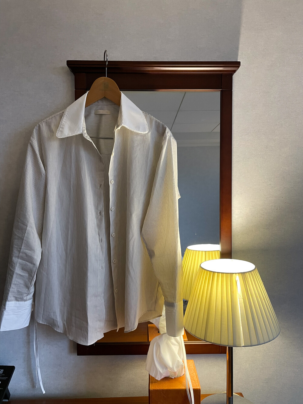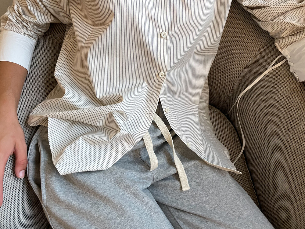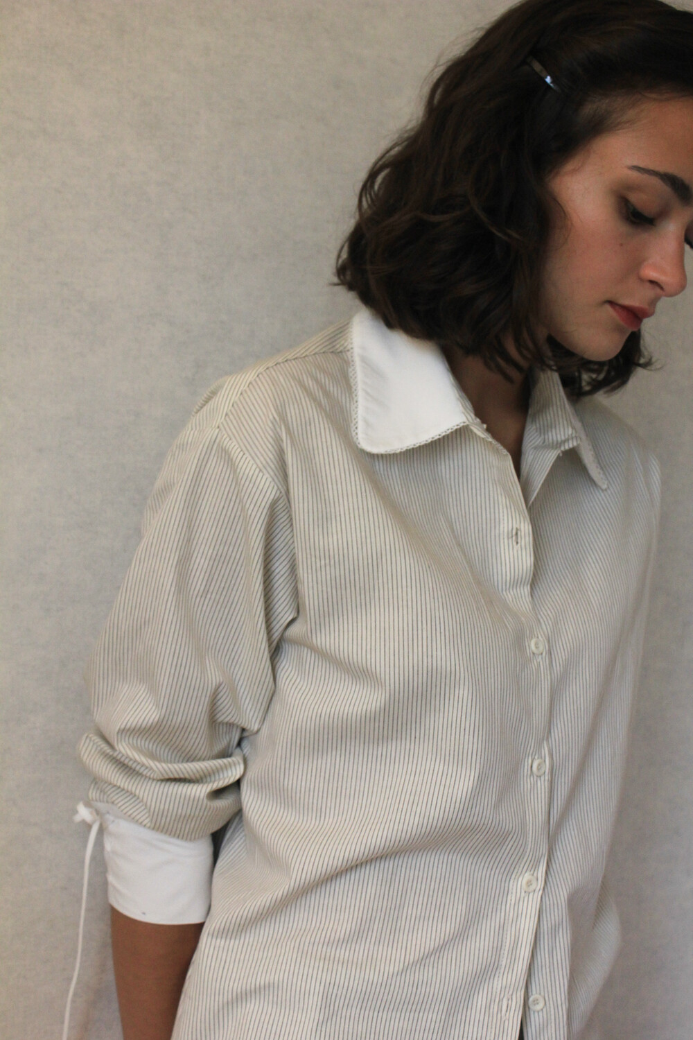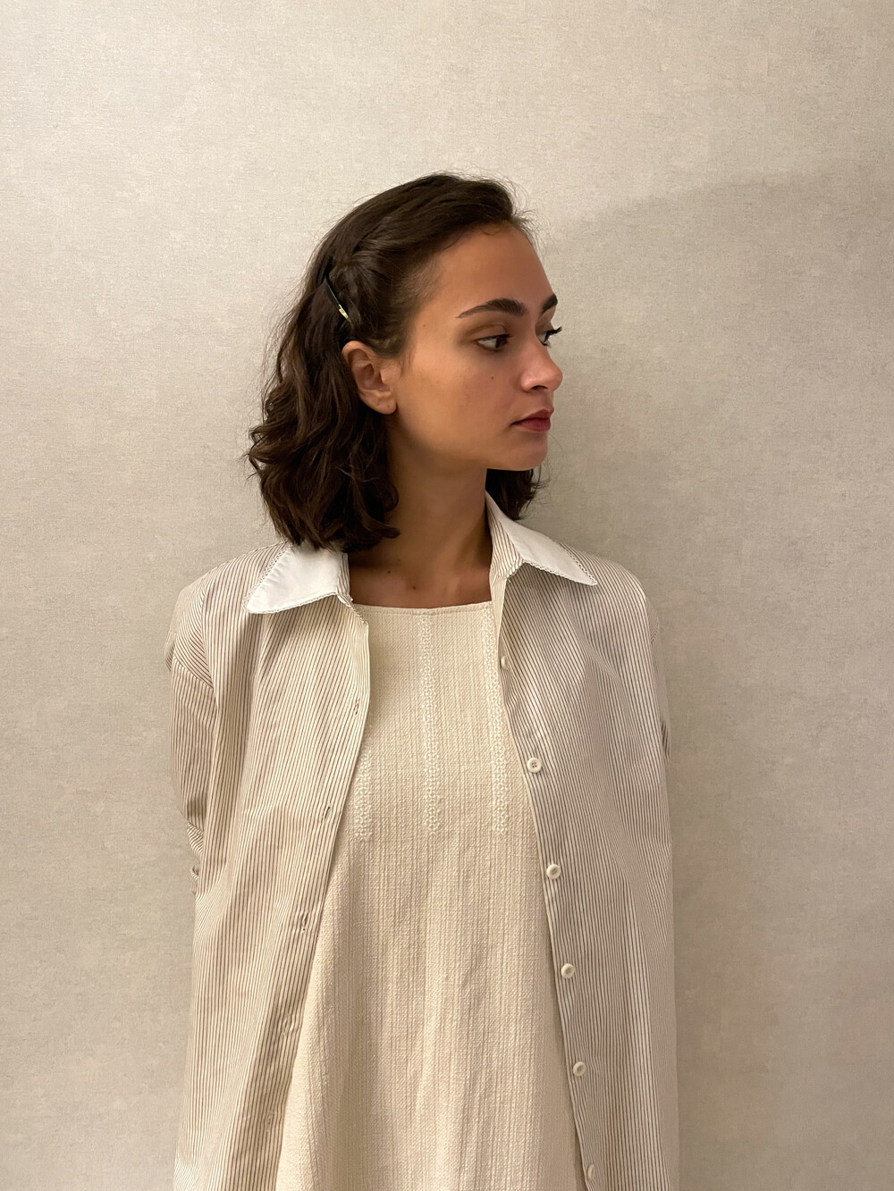 크림 바탕에 브라운 핀 스트라이프가 들어간 셔츠 입니다.