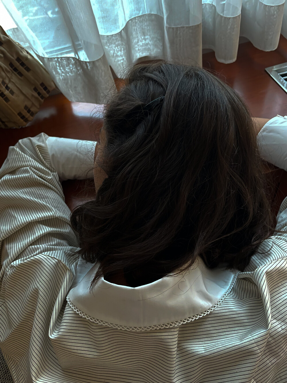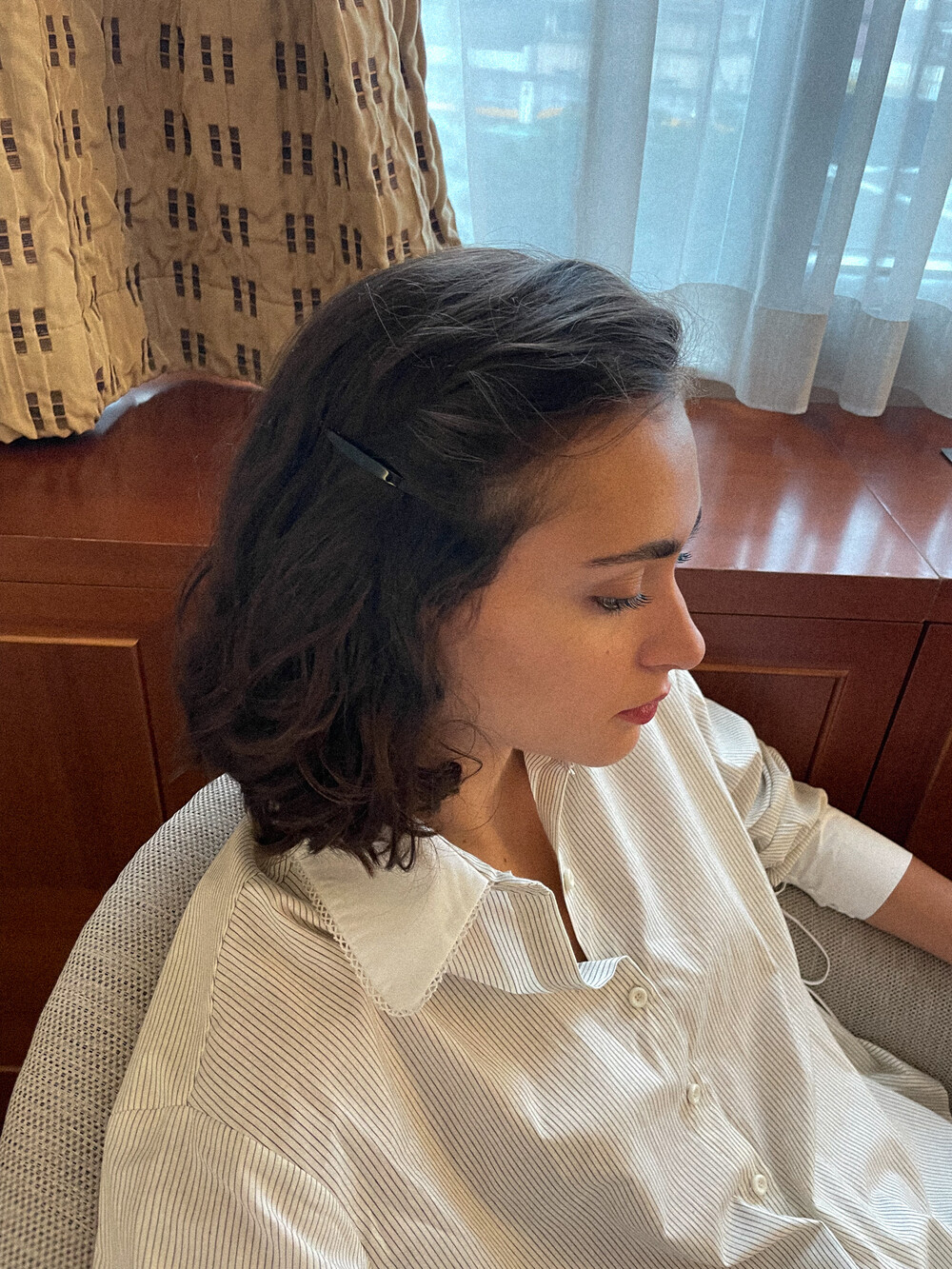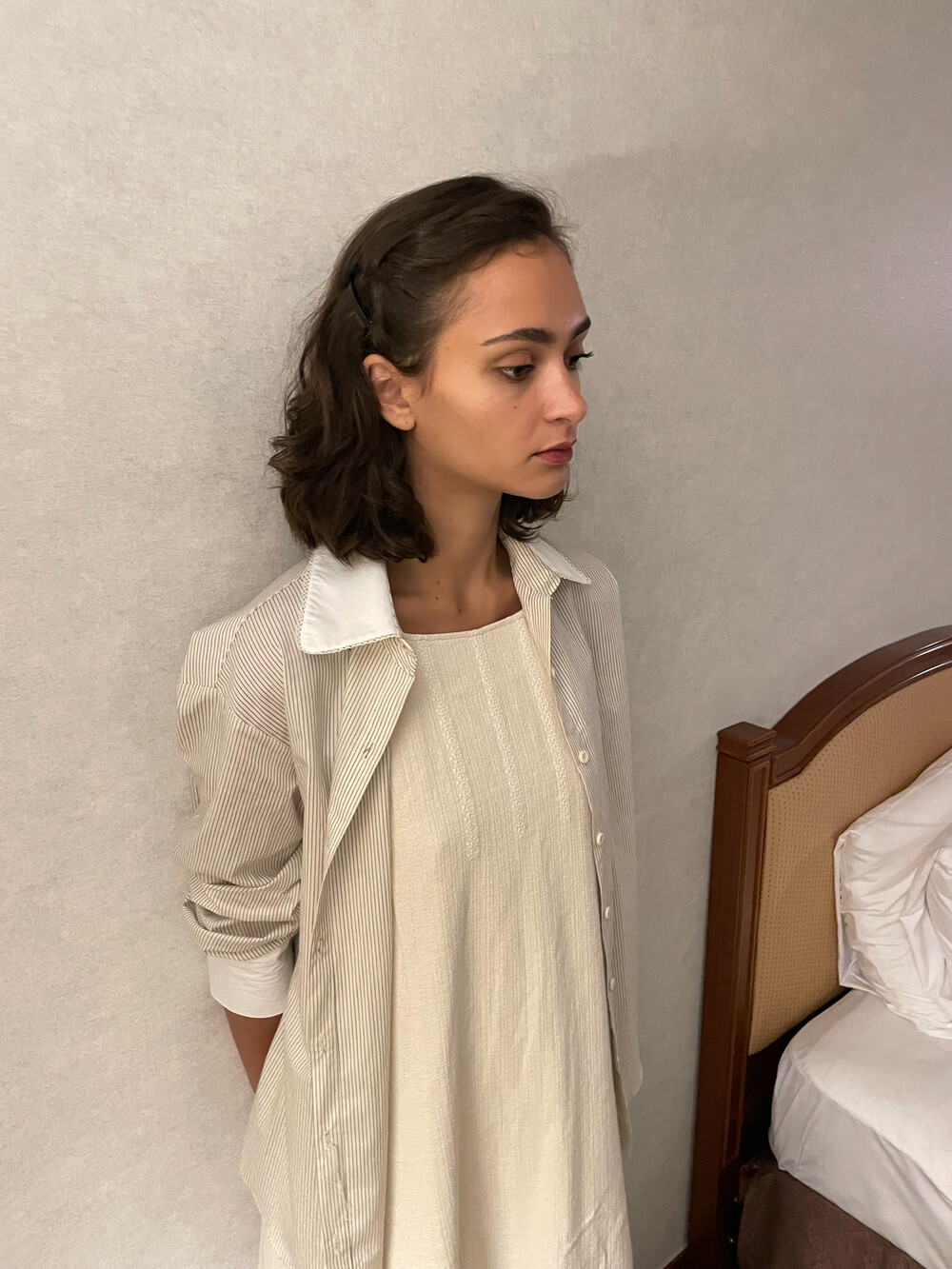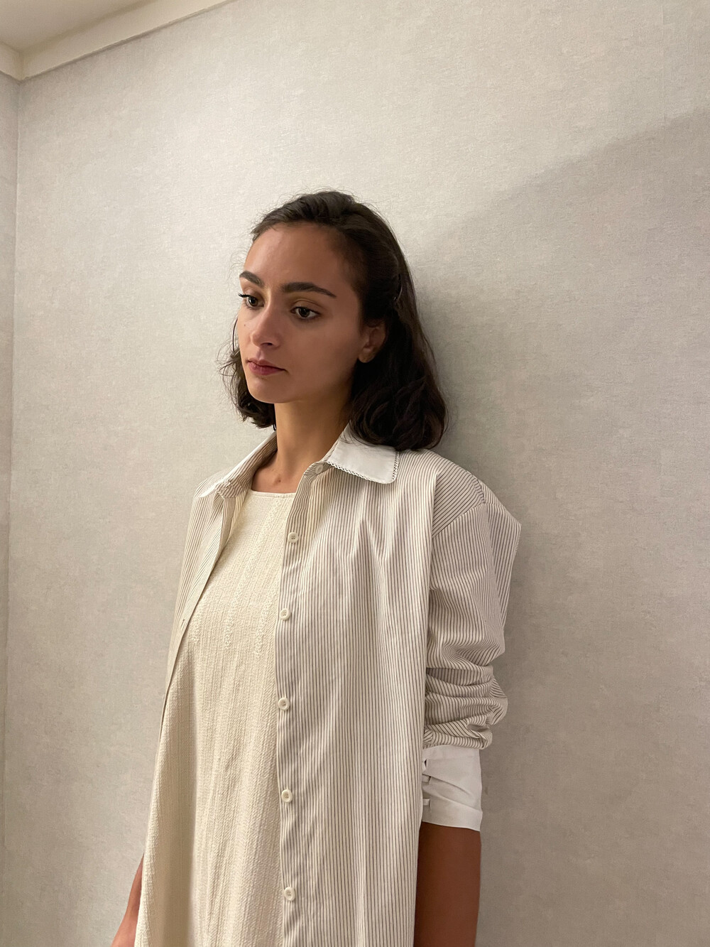 크림 바탕에 브라운 핀 스트라이프가 들어간 셔츠 입니다.