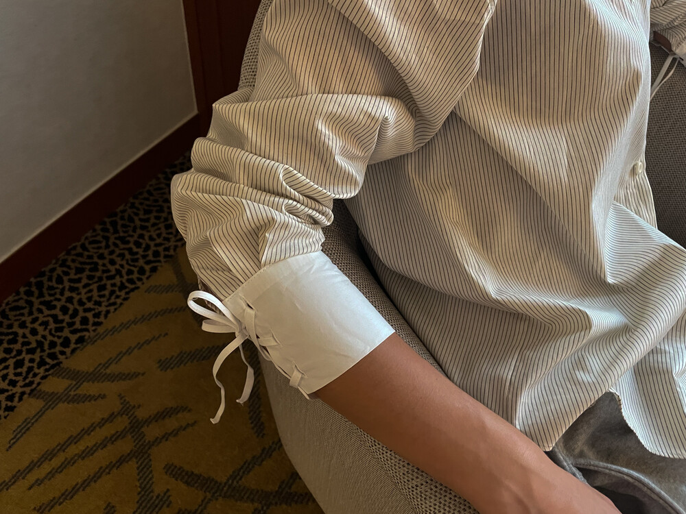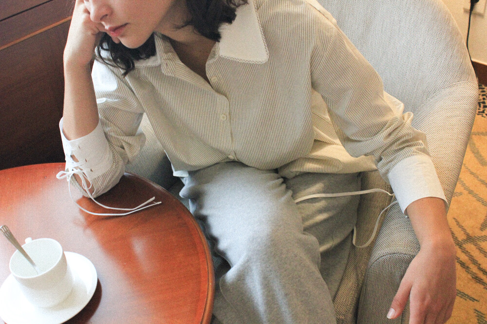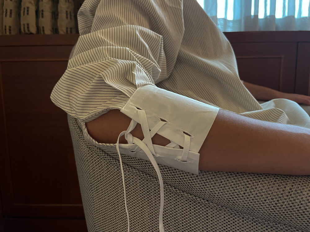레이스로 포인트를 준 화이트 카라와 스트랩 디테일의 커프스가 특징입니다.