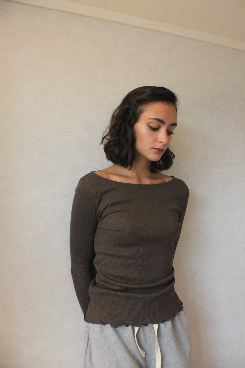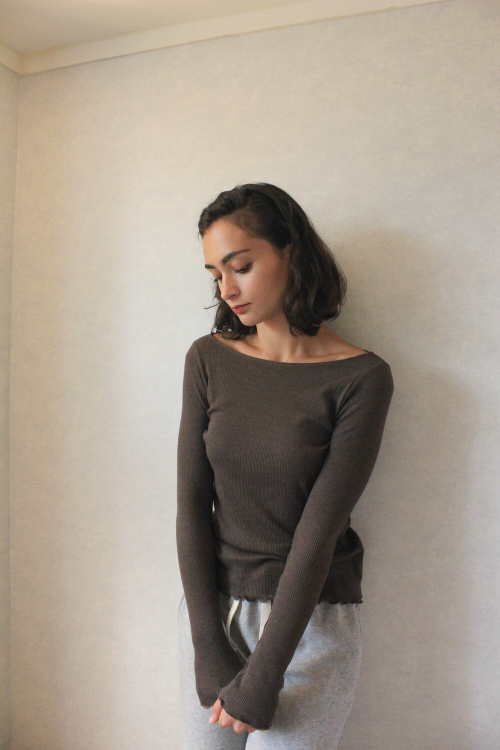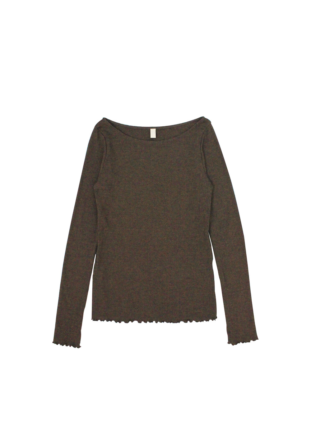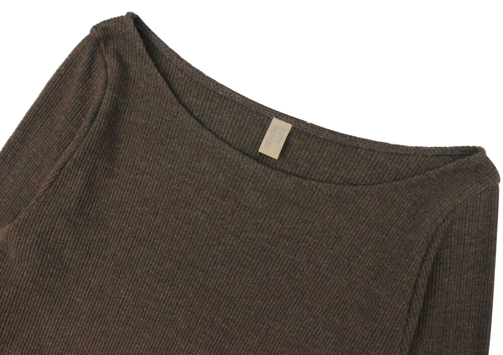 긴 소매 기장으로 손등을 덮어주며 보트넥 디자인이 특징입니다.