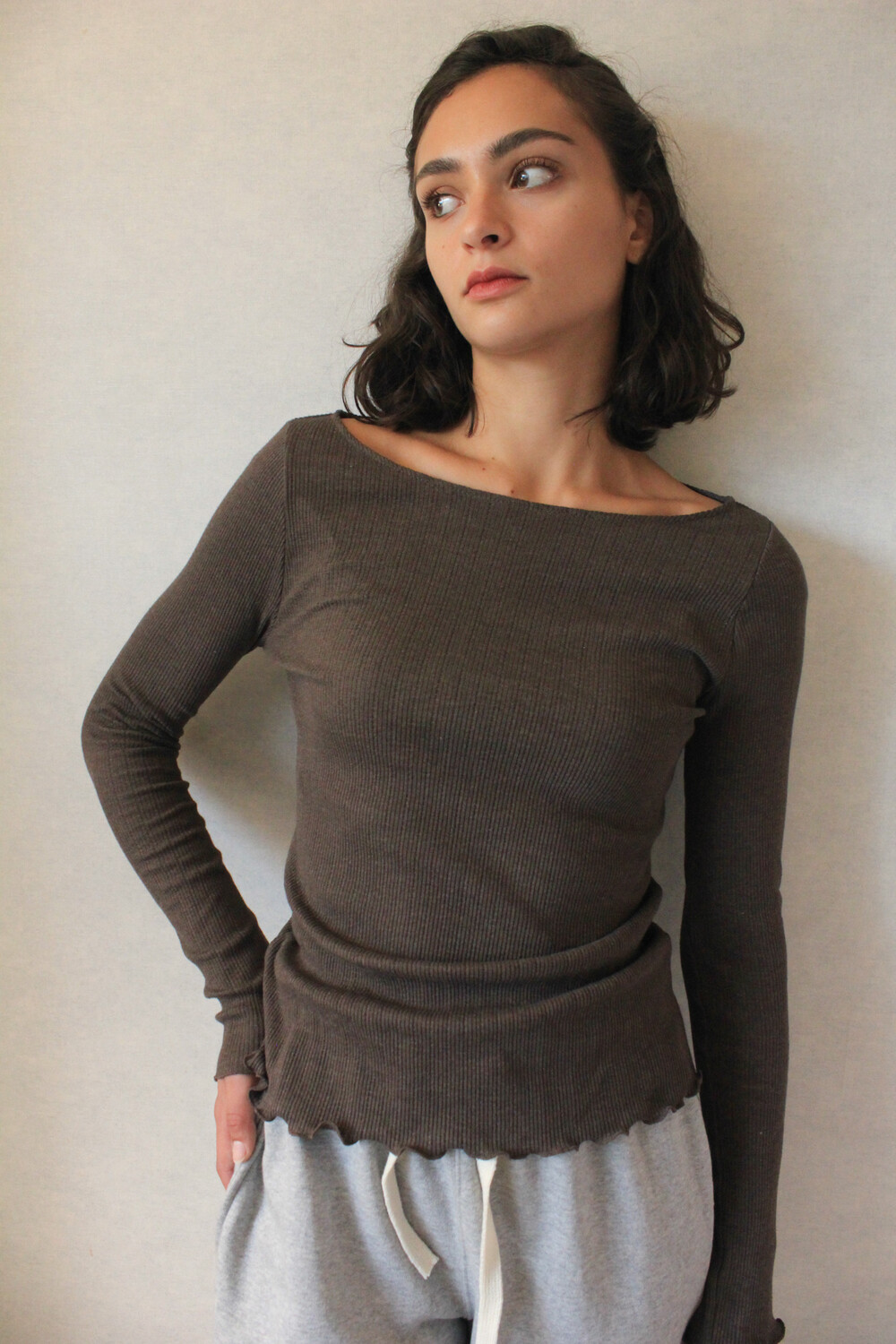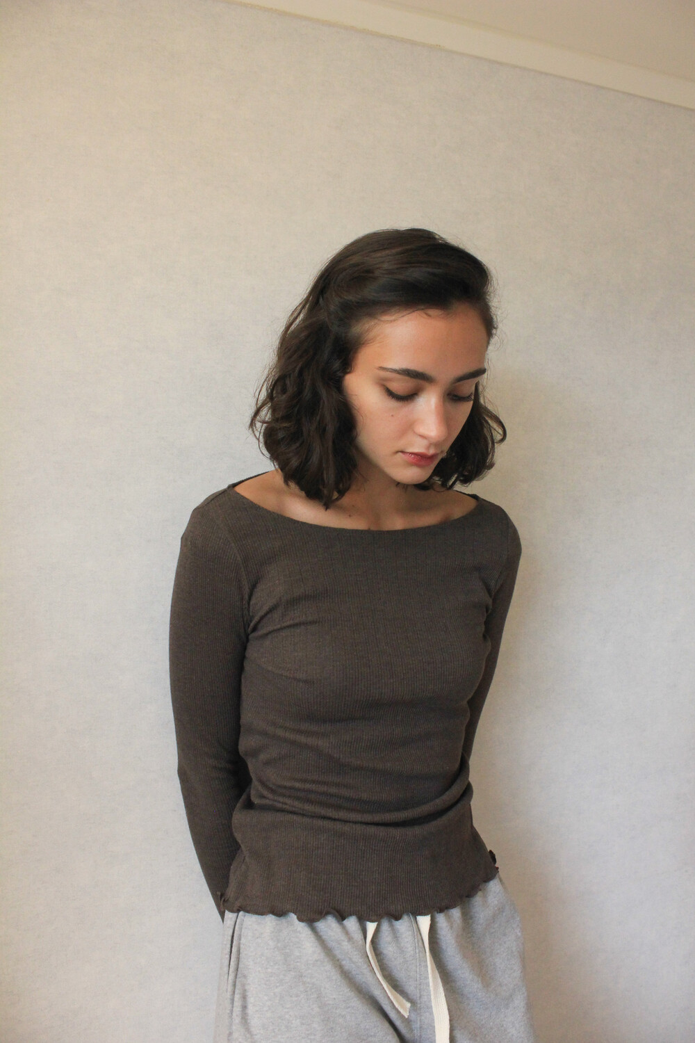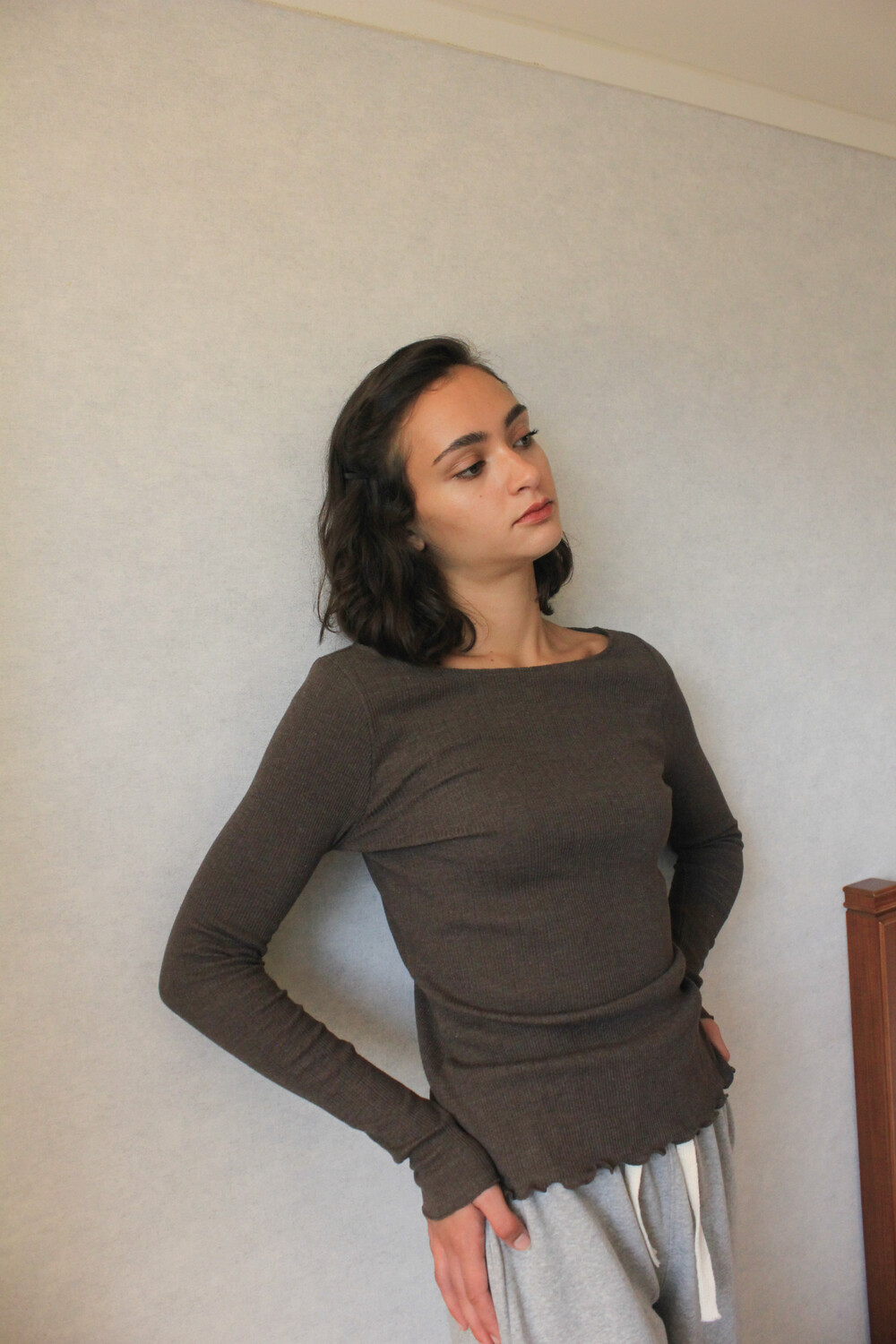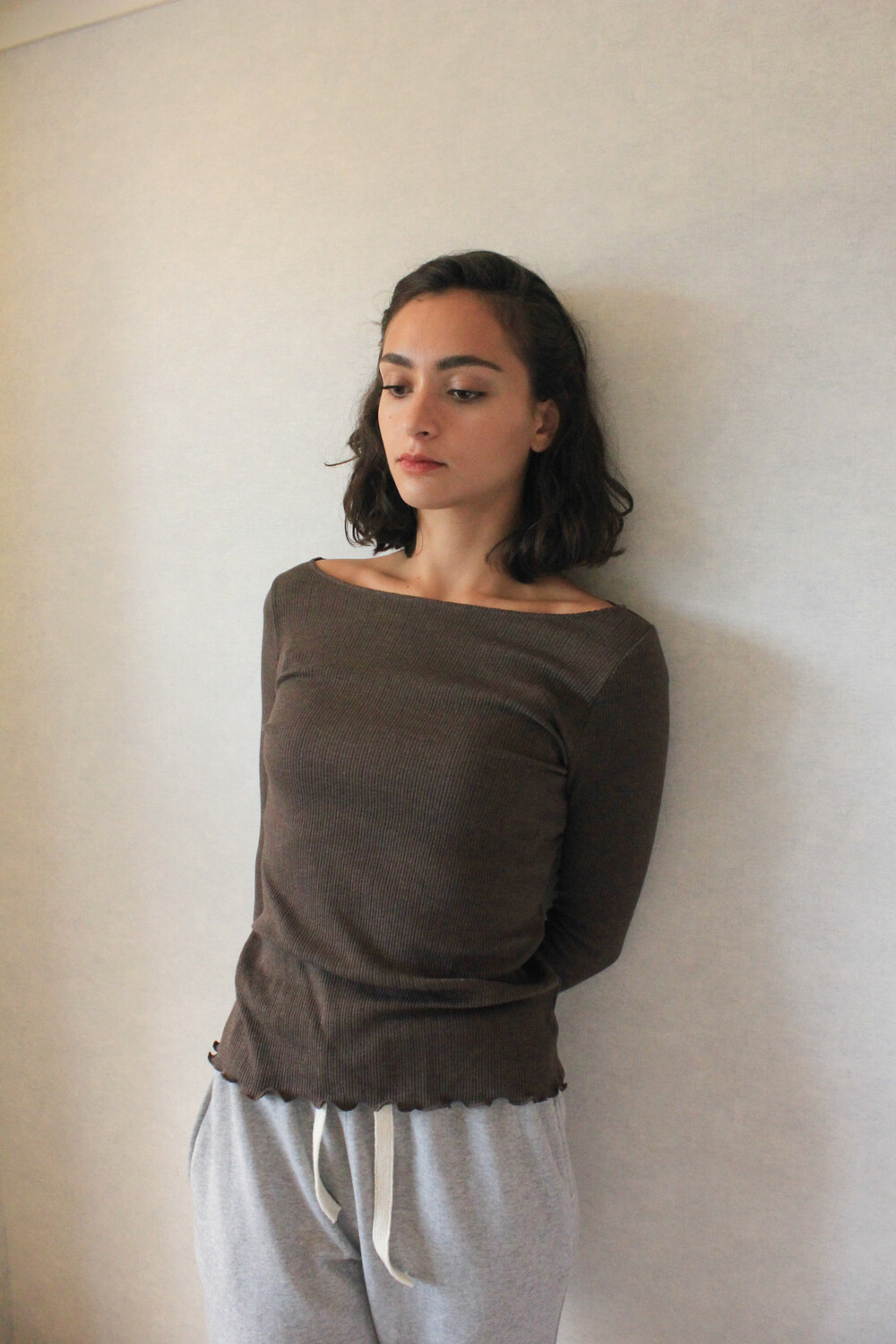 긴 소매 기장으로 손등을 덮어주며 보트넥 디자인이 특징입니다.