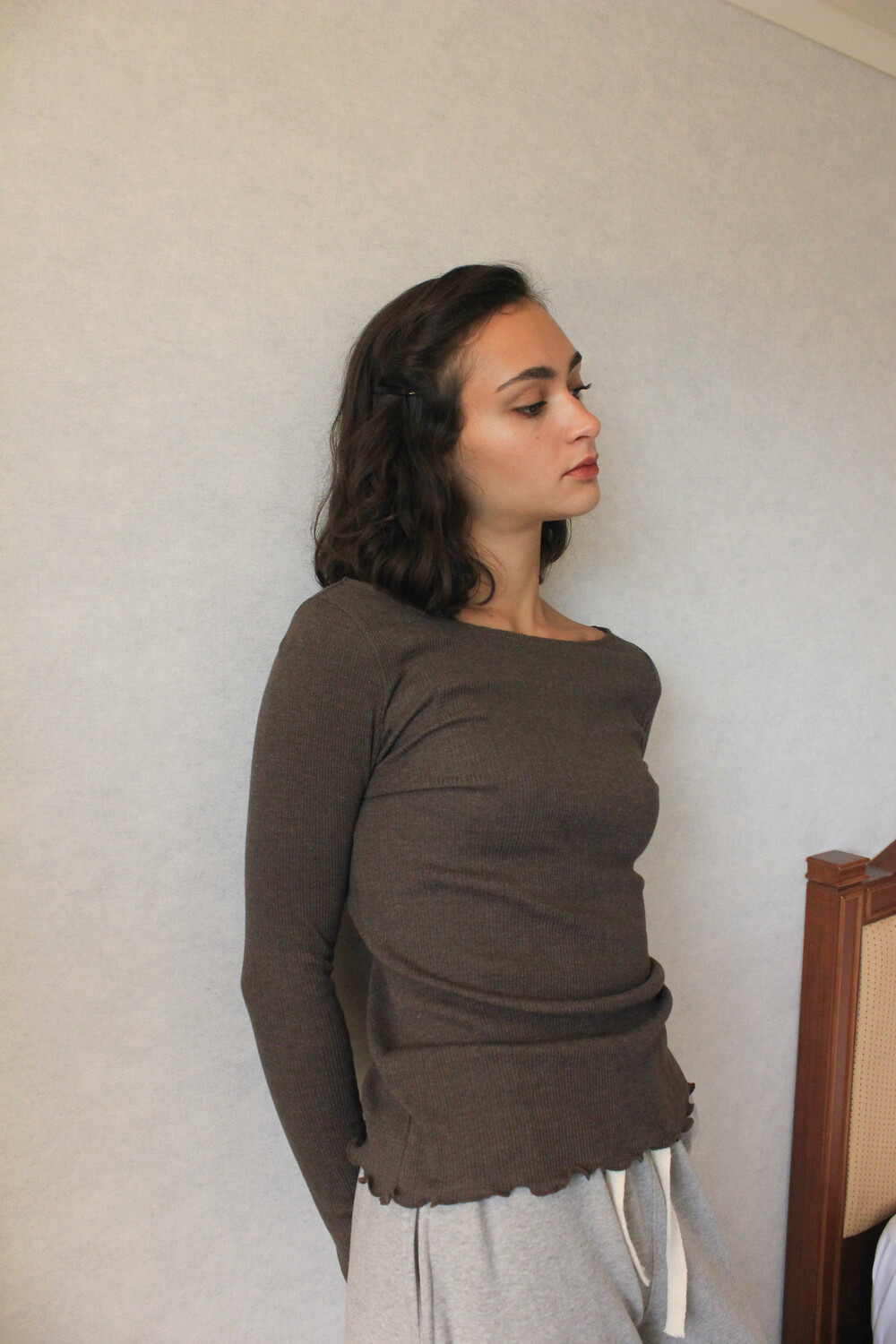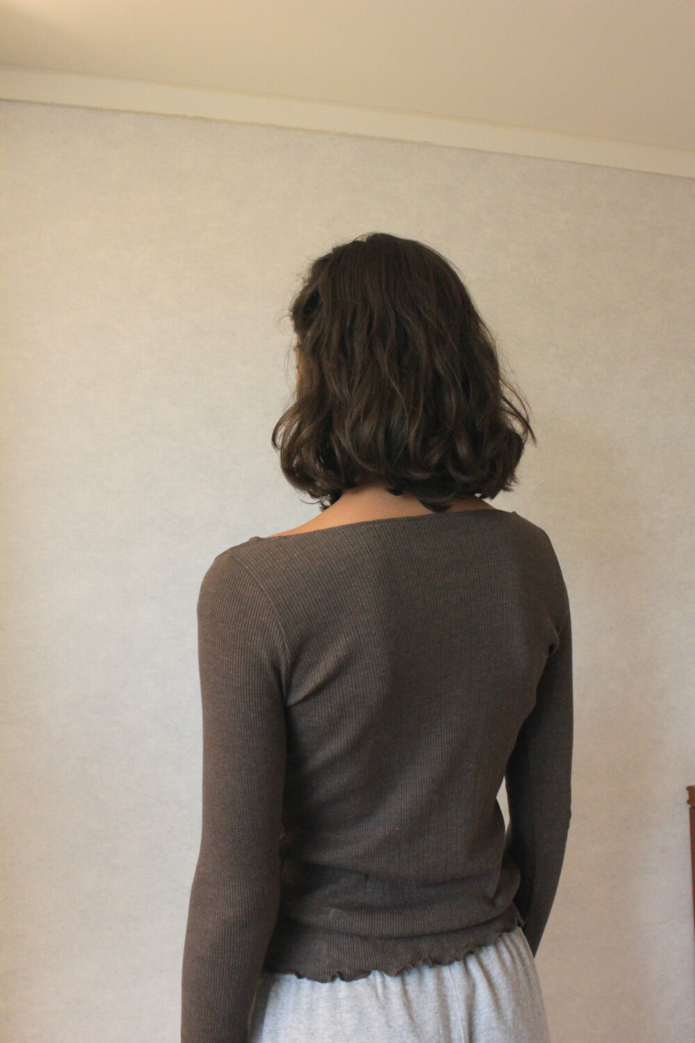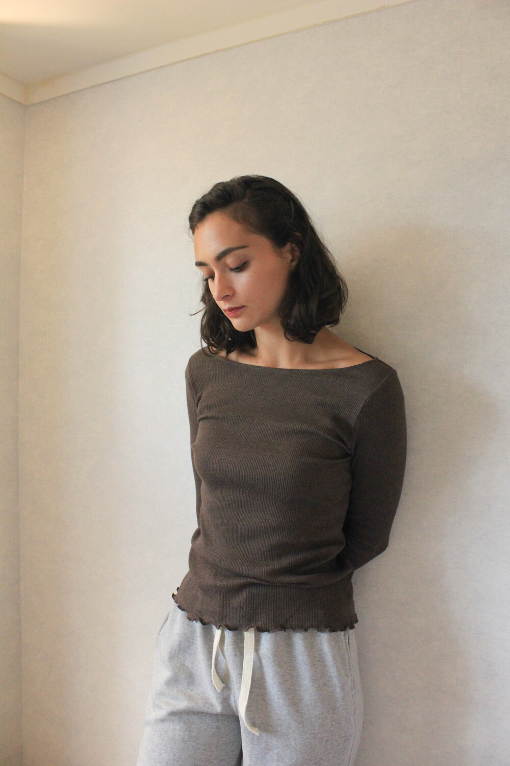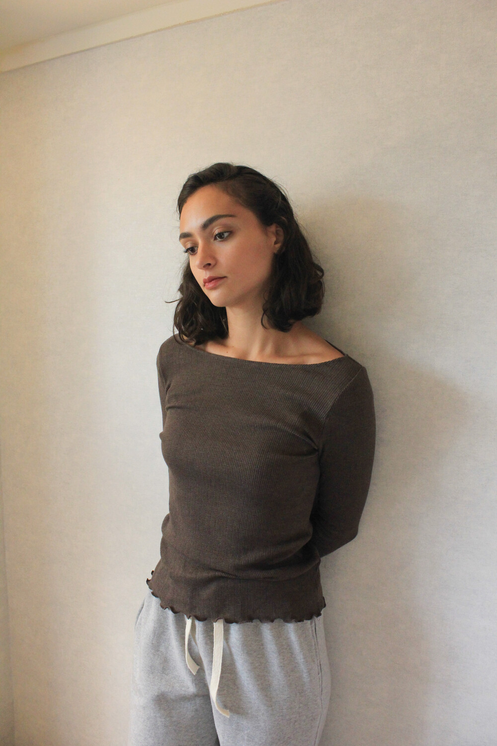 긴 소매 기장으로 손등을 덮어주며 보트넥 디자인이 특징입니다.